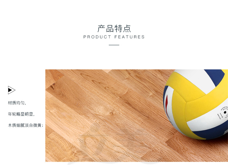 5.排球木地板采用天然木材加工而成,其表面有活节、色差等现象均属正常,也正是色差、天然的纹理、富有变化的肌理结构,彰显了排球木地板的自然风采,故不必太过苛求,但如表面有虫眼、开裂、腐朽、蓝变、死节等缺陷,在施工时可根据铺设需要,或截短,或锯成两半,取其可用而去其缺陷。